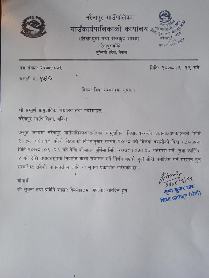 बिदा सम्बन्धी सूचना (विद्यालय तथा मदरसाहरु सबै)