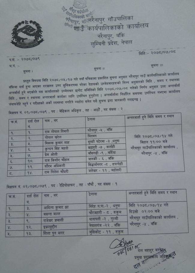 » विज्ञापन नं. १ र २ को अन्तवार्ता सम्बन्धी सूचना (मे.अ. र रेडियोग्राफर)
