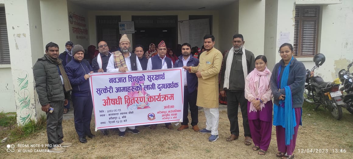 आज मिती २०८०/०८/१८ गतेका दिन नागरिक आरोग्य सेवा केन्द्र नरैनापुरको आयोजनामा नवजात शिशु सुरक्षार्थ सुत्केरी आमाहरुको लागि दुग्धबर्धक औषधि वितरण कार्यक्रम नरैनापुर गाउँपालिका वडा नं. ३ का वडा अध्यक्ष श्री अजय कुमार मिश्र को अध्यक्षता, प्रमुख अतिथि नरैनापुर गाउँपालिका अध्यक्ष श्री इस्तियाक अहमद शाह, विशिष्ट अतिथिमा नरैनापुर गाउँपालिकाका प्रमुख प्रशासकीय अधिकृत श्री मणिराम खराल ज्युको आतिथ्यता नरैनापुर गाउँपालिका वडा नं ३ मा रहेको कालाफांटा स्वास्थ्य चौकीमा सम्पन्न भयको छ।